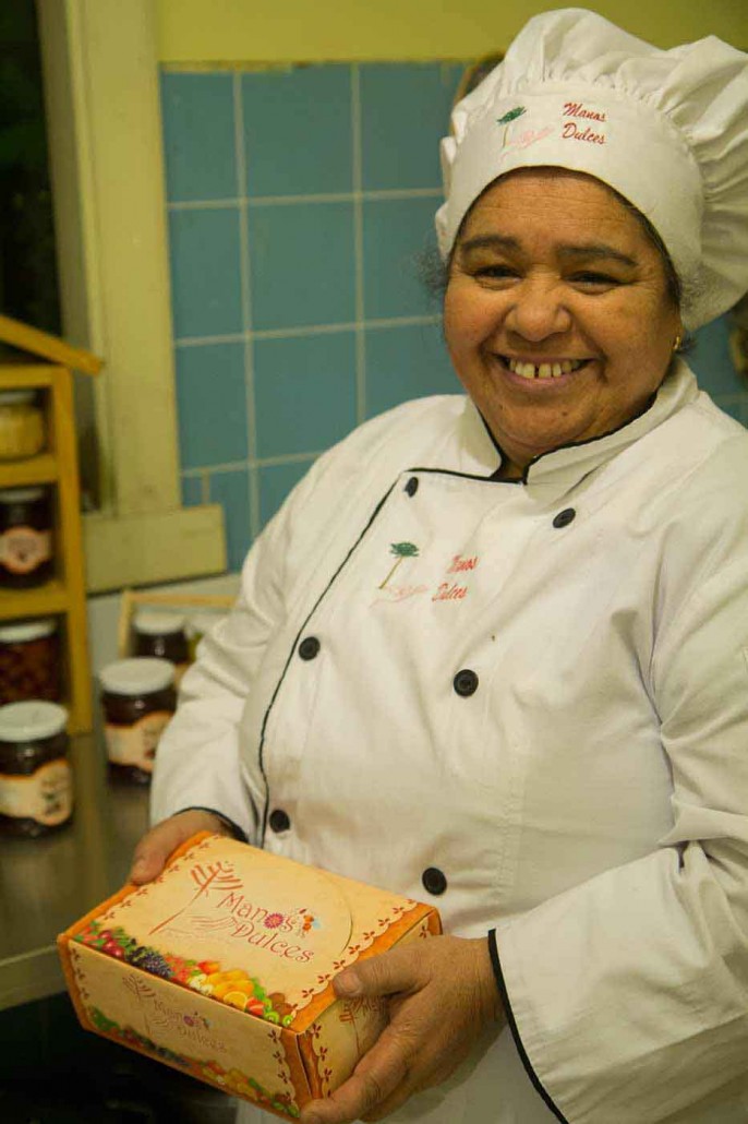 Soy Alejandra Riquelme Rivas. Nací en Coronel; a los 11 años me fui a Talca. Estudie enfermería en el hospital de esa ciudad. Fui a trabajar al hospital de Constitución; conocí a mi marido y nos vinimos a vivir a Lautaro por 5 años. Mis suegros enfermaron, por lo que en un principio vinimos de tránsito a cuidarles a la cuidad de Cunco, finalmente eché raíces. Aquí había abundancia de frutales y todos se los comían los animales y tuve una visión: aprender a hacer mermeladas de calidad. Así fui dando cada paso, me capacité, trabaje con otros, y me di cuenta del valor de hacer un buen producto y así nace Manos Dulces.